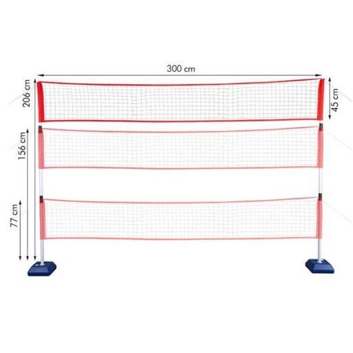 Siatka na najniższym poziomie (77 cm) umożliwia grę w tenisa. I w tym przypadku, NILS wyszedł naprzeciw potrzebom użytkownika i zagwarantował sprzęt w postaci rakiet i piłki. Zatem kupując NT0300 otrzymujemy pełny zestaw, zawierający wszystko czego potrzeba do gry w siatkówkę, badmintona i tenisa.