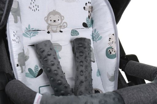 Wkładka jest wykonana z atestowanych materiałów najwyższej jakości. Po założeniu pasów, wkładka dopasuje się do wózka, nie przesuwa się.