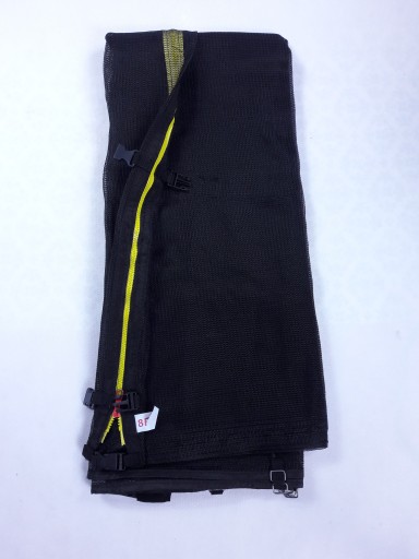 Polecam nową siatkę ochronną wewnętrzną do trampoliny o średnicy ramy 487 cm, ze słupami do 494 cm (16 Ft - stóp), z 6 podwójnymi nogami, na 12 masztów - jak na zdjęciach poniżej. Wysokość całej siatki: 180cm. Wykonana jest z polietylenowych żyłek (takich, jak wędkarskie), dzięki czemu jest bardzo trwała - najlepsza na rynku. Nie bleknie i nie kruszy się nawet po latach. Oczka są bardzo gęste, gramatura zwiększona do 105g/m.kw.(to jest autentyczna waga - nie zawyżona, jak u niektórych sprzedawców). Siatka jest przyczepiana od dołu sznurkiem do trójkątów przy macie trampoliny - w zestawie. U góry wiązana jest do grzybków na końcach słupków. Mocny zamek błyskawiczny zabezpieczony jest dodatkowo klamrą u dołu.