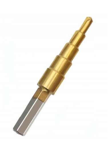 Wiertła stożkowe stopniowe z szybkotnącej stali HSS (High-Speed Steel) to specjalnie zaprojektowane wiertła, które umożliwiają osiągnięcie idealnie stożkowych otworów o różnych średnicach, bez konieczności korzystania z wielu narzędzi. Szlifowane wiertło ze stali szybkotnącej (HSS) pokryte powłoką z tytanu wierci najcieńsze blachy bez uprzedniego nawiercania, bez zadziorów, bez przywierania wiórów do wiertła.