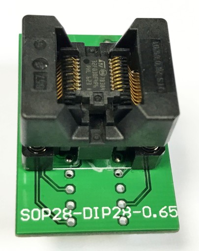 Zastosowana profesionalna podstawka ZIF (OTS-20(28)-0.65-01) z systemem dual clamp chwyta wyprowadzenia układu zarówno z góry jak i z dołu (a nie tylko z dołu jak tańsze podstawki) - co zapewnia lepszy kontakt z układem.