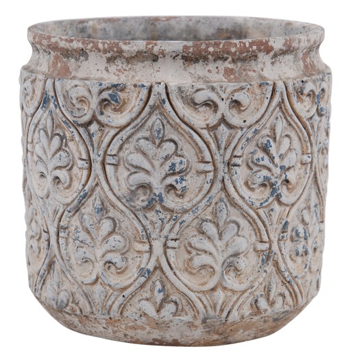 Doniczka wykonana z cementu w kolorze szarym z brązowymi i niebieskimi przetarciami. Subtelne kolory i wyraziste, wypukłe zdobienia przywołujące motyw roślinny pozwolą stworzyć przyjemną i naturalną atmosferę w każdym wnętrzu.