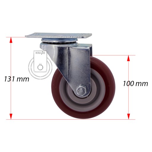 - OBUDOWY wykonane są blachy stalowej o dużej wytrzymałości. Płytka ma wymiary 95x65x3 mm. Kółka mają średnicę 100 mm, a centra mocowań mają wymiar 75 x 45 mm i owalne otwory do mocowania o wymiarach 12 x 8,5 mm. Wysokość całkowita wynosi 131 mm.