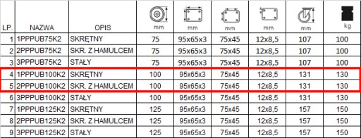Zestaw składa się z czterech kółek wyposażonych w mocowanie na płytkę. W skład zestawu wchodzą dwa zestawy skrętne o kodzie 1PPPUB100K2 (poz.4 w tabeli) oraz dwa koła skrętne z hamulcem o kodzie 2PPPUB100K2 (poz. 5 w tabeli).