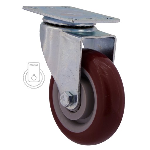 Koło posiada piastę polipropylenową oraz oponę poliuretanową, obudowa pokryta jest ocynkiem.