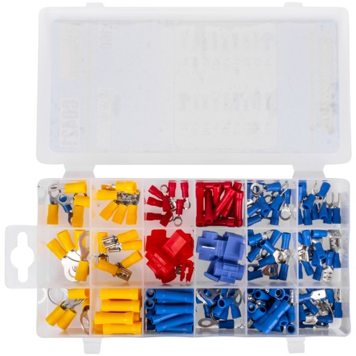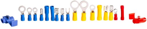 - W zestawie znajdują się między innymi izolowane konektory, nasuwki, wsuwko - nasuwki, oczkowe, cylindryczne, widełki, łączniki.