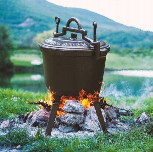 Oryginalny kociołek marki Emalia Rybnik. Wykonany z najwyższej jakości stopu żeliwa odpornego na najwyższe temperatury. Posiada specjalny odpowietrznik w pokrywie, który reguluje ciśnienie wewnątrz kociołka, przez co jest on w 100% bezpieczny. Kociołek może stać bezpośrednio w ognisku, a dzięki poręcznemu uchwytowi może być zawieszony również nad ogniskiem. Produkt posiada również odkręcane nóżki, przez co kociołek można umieścić w kominku lub bezpośrednio w palenisku. Dzięki wytłoczeniu na pokrywie masz pewność, że kupujesz oryginalny i bezpieczny produkt.