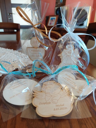PRZEDSTAWIAMY ELEGANCKIE, GOTOWE DO WRĘCZENIA -PODZIĘKOWANIA DLA GOŚCI z okazji UDZIAŁU w uroczystości I KOMUNII ŚWIĘTEJ / CHRZTU -- w formie drewnianych magnesów na lodówkę.