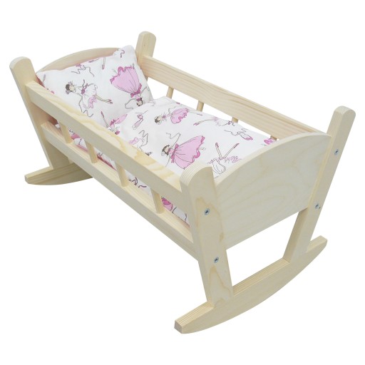 Przepiękna drewniana kołyska dla lalek, z drewna świerkowego z kompletem pościeli.