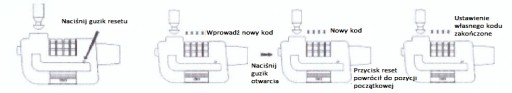 - Jeżeli chcesz zmienić kod, wprowadź kod, który jest obecnie ustawiony (kod początkowy to 0000), następnie wciśnij przycisk resetu używając ostrego przedmiotu jak np. końcówka długopisu, w tym samym czasie wprowadź nowy kod. Teraz wciśnij przycisk otwierania, co spowoduje, że przycisk resetu wróci na swoją pozycję.