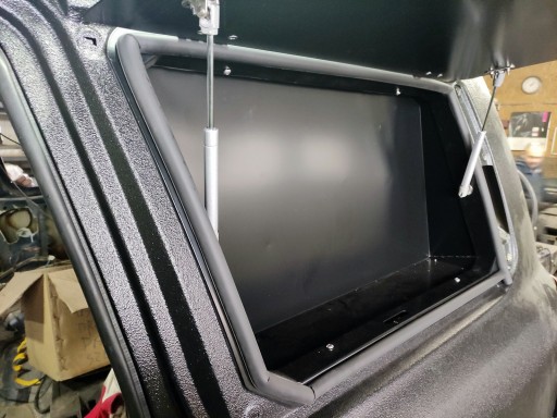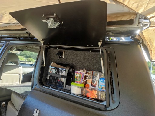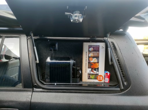 Schowek w okno szyby bagażnika, bardzo przydatny bajer, np. na ekspres do kawy ;) Metalowa ramka i plecy, pokrywa aluminiowa, wszystko lakierowane proszkowo. Zamek z kluczykiem. Plecy można odkręcić i wtedy zostaje samo okno, przez które można zajrzeć do bagażnika (fajny dostęp przy zapakowanym aucie). Wnętrze nietapicerowane. Montaż na kleju do szyb, zawiasy klapy najlepiej na nitonakrętkach do karoserii. Bardzo fajny i przydatny gadżet, ogromna ilość możliwych zastosowań i kombinacji.