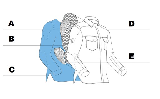 - koszula wyposażona w komplet przewiewnych, certyfikowanych protektorów pleców (lvl2), barków (lvl2), łokci (lvl2),