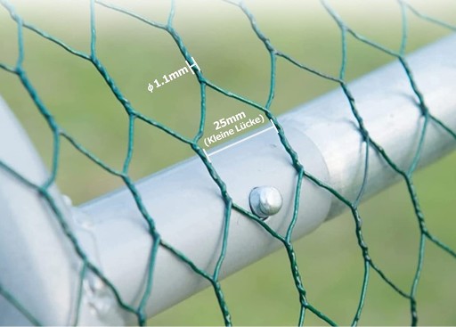 Średnica siatki sześciokątnej 25 mm, średnica drutu siatki na kurczaki wynosi 1,1 mm. Mniejsza siatka chroni drób przed drapieżnikami i jednocześnie zapewnia cyrkulację powietrza.