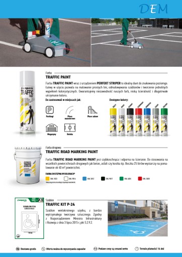 - 1 puszka pozwala nam namalować linie o długości min. 40m.b. (przy chropowatej powierzchni oraz szerokości linii ok. 10cm).