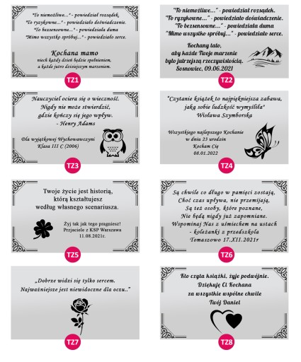 Jeżeli zależy Ci na wykonaniu dedykacji zgodnie z którymś z przedstawionych projektów, daj nam znać w wiadomości który projekt Ci się spodobał! Jeżeli wyślesz sam tekst - wykonamy dedykację bez dodatkowych zdobień i symboli.