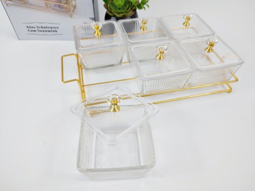 Serwis do przystawek składa się z misek szklanych przedzielonej na 6 części i wszystko na stojaku z metalu