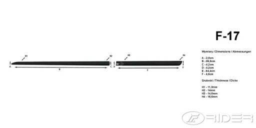 Samochodowe listwy boczne RIDER bardzo dobrze zabezpieczają drzwi samochodu oraz ich przetłoczenia przed obiciami i zarysowaniami mogącymi powstać podczas parkowania w ciasnych przestrzeniach. Listwy montowane są bez ingerencji w nadwozie samochodu. Montaż odbywa się za pomocą taśmy samoprzylepnej 3M fabrycznie zaaplikowanej na powierzchnię listew.