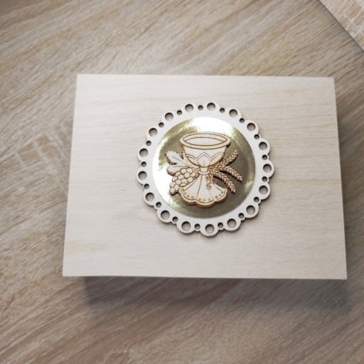 - Pudełko na wierzchu posiada wycięty ze sklejki kielich umieszczony na lustrzanym podkładzie