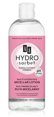 Program oczyszczających produktów AA Hydro Sorbet stworzono z myślą o efektywnym usuwaniu zanieczyszczeń i zachowaniu optymalnego poziomu nawilżenia w naskórku. Multinawilżający płyn micelarny z ekstraktem z aceroli i witaminą E doskonale i szybko oczyszcza skórę bez użycia wody – zapewniając komfortowy demakijaż i nie naruszając równowagi fizjologicznej.