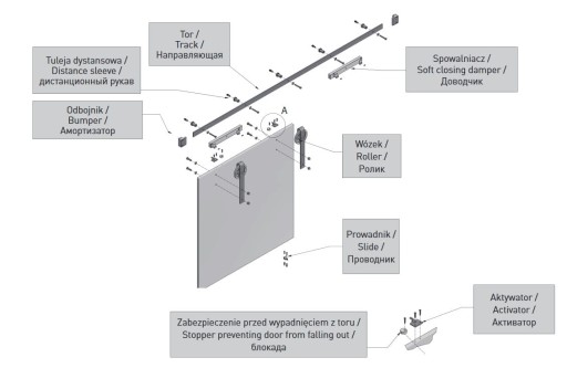 W zestawie znajduje się specjalny spowalniacz dedykowany do drzwi BARN DOOR, który poprawia komfort użytkowania systemu.