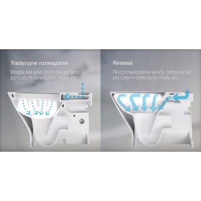 Nasze muszle wyposażone są w innowacyjny system Rimless, który pozwala na łatwe utrzymanie higieny poprzez redukcję używania środków chemicznych. System ten ogranicza również zużycie wody nawet do 30%, co ma pozytywny wpływ zarówno na środowisko jak i na budżet domowy.