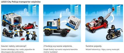 Co jest w pudełku? Dzieci znajdą tam elementy do zbudowana furgonetki więziennej, samochodu pomocy drogowej oraz policyjnego motocykla, a do tego cztery minifigurki: Duke'a DeTaina z serialu LEGO® City, Snake'a Rattlera i przestępczynię Clarę.