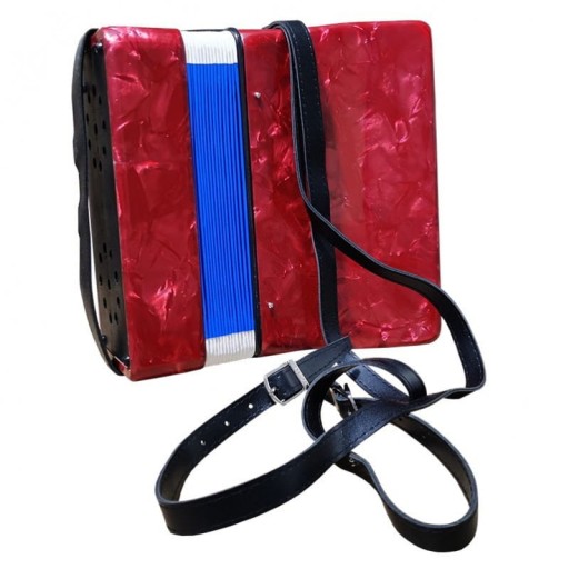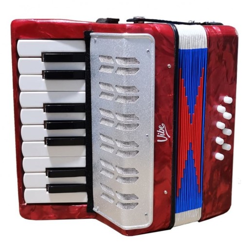 VIBE ZENEK R to doskonały akordeon dla dzieci przeznaczony głównie do nauki oraz zabawy, wyposażony w 17 wiolinowych i 8 basowych klawiszy. Instrument jest bardzo lekki. Posiada czerwoną, perłową obudowę i niebiesko-czerwony miech z białymi narożnikami. Piszczałki ukryte zostały pod chromowaną, aluminiową maskownicą, która stanowi eleganckie wykończenie całego instrumentu. Harmonia posiada również solidne szelki, które zapewniają wygodę podczas grania. To mały akordeon stanowiący doskonały instrument dla początkujących muzyków, w bardzo atrakcyjnej cenie od sklepu muzycznego