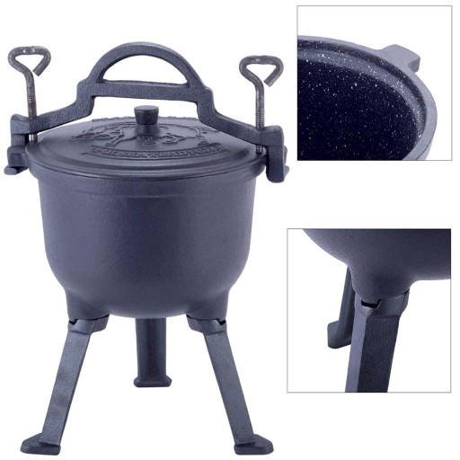 Produkt posiada odkręcane nóżki, przez co kociołek można umieścić w kominku lub bezpośrednio w palenisku. Dzięki wytłoczeniu na pokrywie masz pewność, że kupujesz oryginalny i bezpieczny produkt.