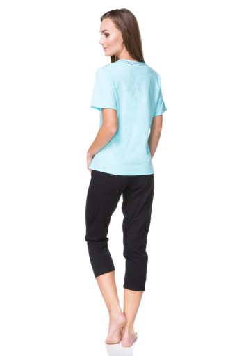 Komplet posiada bluzkę w kolorze turkusowym, z krótkim rękawem i zabawnym nadrukiem psa w okularach oraz czarne spodnie długości do łydki, o lekko zwężanym fasonie.