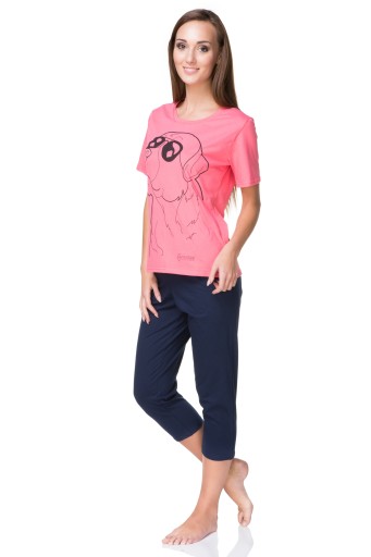 Komplet posiada bluzkę w kolorze malinowego różu, z krótkim rękawem i zabawnym nadrukiem psa w okularach oraz granatowe spodnie długości do łydki, o lekko zwężanym fasonie.