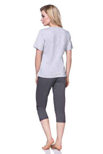 Posiada koszulkę w kolorze szaromelanżowym, z krótkim rękawem, okrągłym dekoltem pod szyję i nadrukiem dwóch kotków oraz grafitowe spodnie długości do łydki z wywiniętymi nogawkami i aksamitną kokardką w odcieniu bluzki.