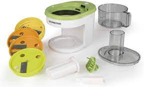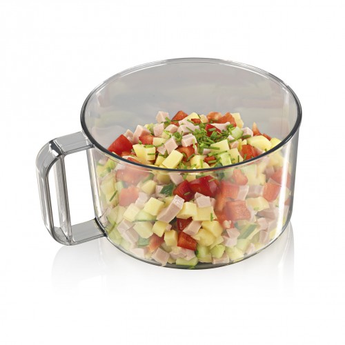 - Zakres dostawy: 1 x jednostka silnikowa, pokrywa z rynną paszową, 1 x popychacz, 1 x krajalnica do plastrów, 1 x drobna tarka, 1 x gruba tarka, 1 x kostkarka, 1 x pojemnik zbiorczy (1500 ml), 1 x czyszczenie szczotka, 1 x stempel czyszczący