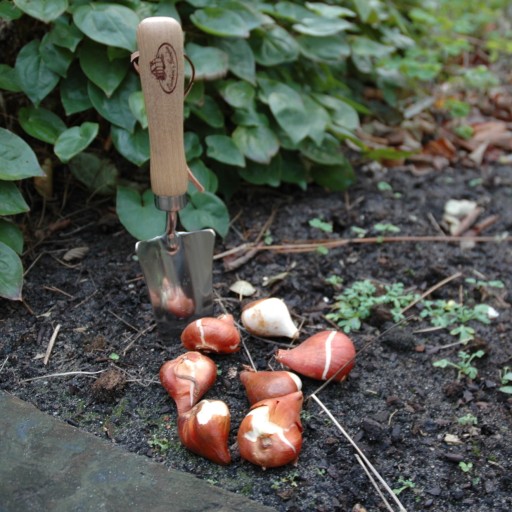 Na łopatce wyryta jest miarka w centymetrach i calach co może być pomocne podczas sadzenia cebulek kwiatowych.