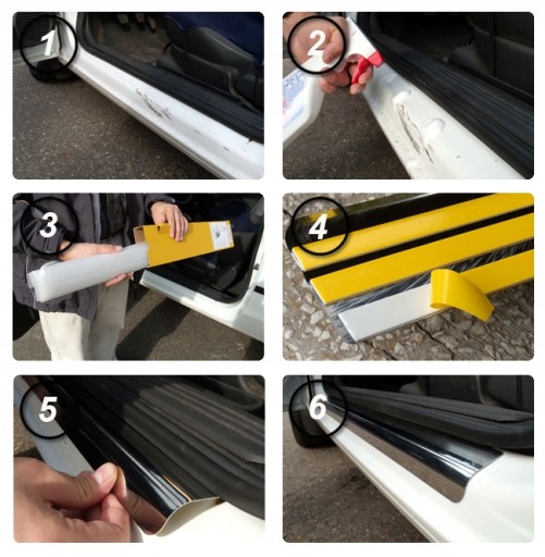 Należy oczyścić, następnie odtłuścić próg i przykleić nakładkę (nakładki mają już dwustronną, bardzo mocną taśmę klejącą)