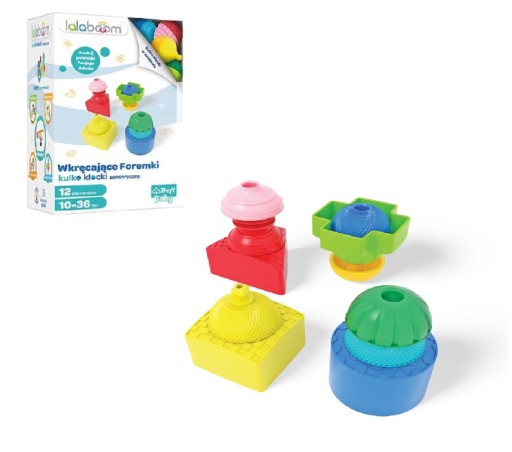 Zestaw Wkręcające Foremki Lalaboom dostarcza wiele zróżnicowanych wrażeń dotykowych ze względu na różne faktury poszczególnych elementów. Umożliwia zabawę w rozpoznawanie kształtów, a także daje możliwość ćwiczenia ruchów obrotowych nadgarstka. Zabawka wspiera ćwiczenie koordynacji wzrokowo-ruchowej. Zestaw można łączyć z innymi zabawkami serii Lalaboom