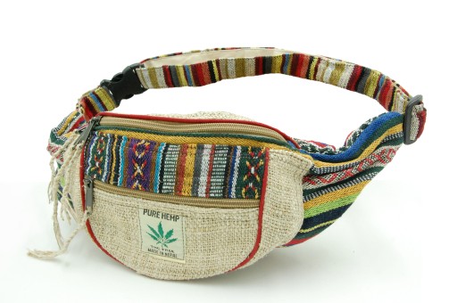 Biodrówka wykonana ręcznie w Nepalu z naturalnych włókien: konopi himalajskich oraz mocnej bawełny. Posiada dwie komory zapisane na wysokiej jakości zamek błyskawiczny oraz regulowany pasek (maksymalny obwód do 120 cm). Wnętrze wykończone jest bawełnianą podszewką.
