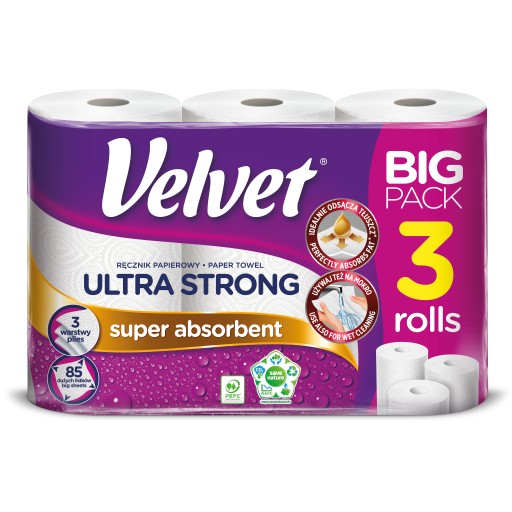 Ręcznik papierowy Velvet Ultra Strong, 3-warstwowy, 3 rolki.