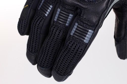 Wstawki z naturalnej skóry na wewnętrznej części dłoni poprawiają trwałość rękawic, a tkanina Hi-flow 3D Mesh na palcach i w okolicy mankietu zapewnia dodatkową cyrkulację powietrza.