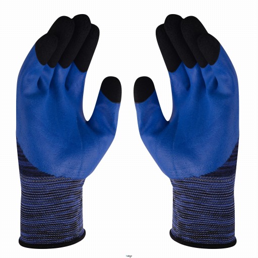 Rękawice uszyte są z wytrzymałej poliestrowej dzianiny w kolorze niebieskim. Do kości śródręcza powleczone są gładkim lateksem, a końcówki palców spienionym lateksem, co gwarantuje dobry chwyt oraz czucie trzymanych przedmiotów, a także chroni przed odciskami. Rękawice zakończone są elastycznym ściągaczem, który jest przyjemny w dotyku oraz idealnie dopasowuje się do kształtu nadgarstka, zapewniając pełen komfort pracy. Dodatkowo są odporne na ścierania, przecięcia, rozdarcia i przekłucia, co gwarantuje ich długą żywotność.