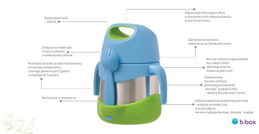 • do termosu dołączono silikonowy bezpieczny widelczyk, który mocowany jest do silikonowej podstawy (kompaktowy zestaw, który łatwo zabrać ze sobą tam, gdzie będzie potrzebny);