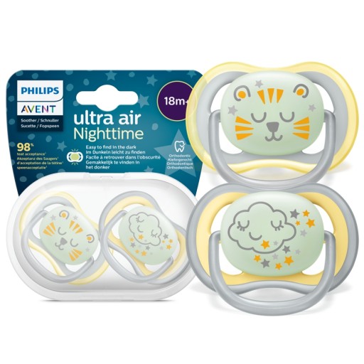 Łatwy do znalezienia przy zgaszonym świetle. Użyj świecącej w ciemności tarczy smoczka ultra air, aby szybko znaleźć smoczek dziecka bez włączania światła*.