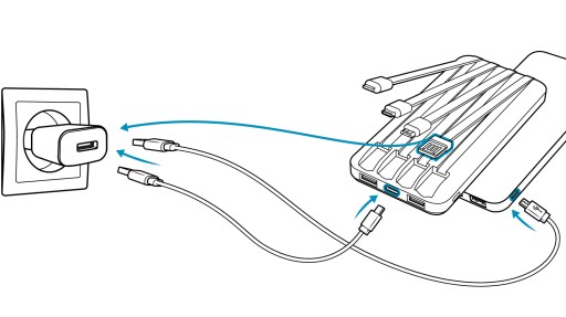 - powerbank - 10000 mAh z kablami USB + USB-C + Lightning + microUSB