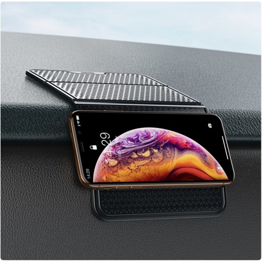 Elastyczna mata jest wykonana z miękkiego tworzywa sztucznego, a jej powierzchnię wykończono specjalną fakturą. Dzięki materiałowi i strukturze, doskonale przylega do gładkich powierzchni. Jeśli umieścisz ją na desce rozdzielczej, będzie idealnym uchwytem na zegarek, kabel czy ładowarkę samochodową.