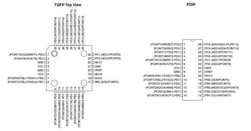 - Wyprowadzenia: TQFP32 (raster: 0,8mm / rozmiar 7x7mm) -->PDIP28 jak na schemacie po prawo zgodnie z kartami katalogowymi np. układów rodziny ATmega.