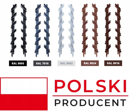 - 5 kolorów do wyboru: czarny (RAL 9005), antracyt (RAL 7016), , ciemny brąz (RAL 8016), brąz (RAL 8024), biały (RAL 9003)
