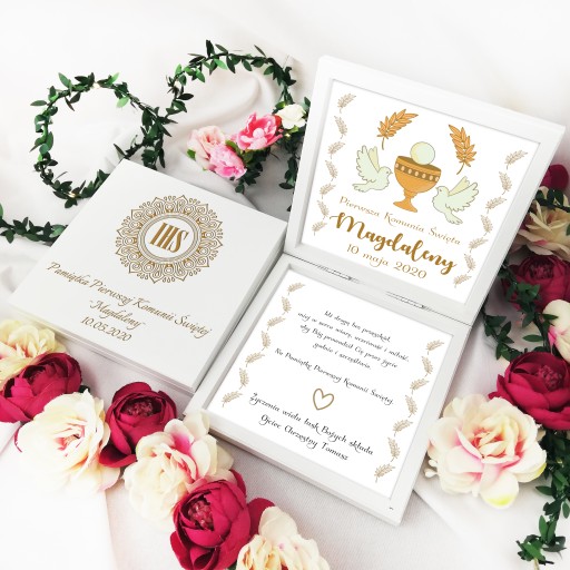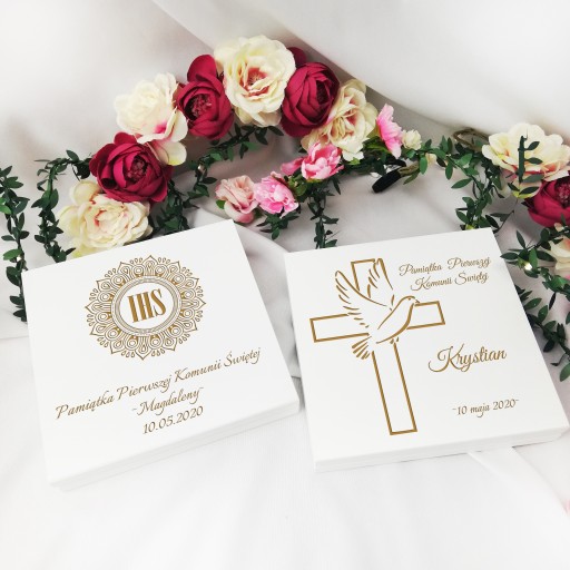 Wyjątkowe i niepowtarzalne pudełeczko, które kryje w sobie pieniądze oraz życzenia! To oryginalny upominek zarówno dla chłopca, jak i dziewczynki, które wstąpiło w Sakrament Pierwszej Komunii Świętej. Będzie niezapomnianym i trwałym prezentem, idealnym na tak ważną okazję. Z pewnością doskonale odda wyjątkowy charakter tego wydarzenia. Na wieczku pudełka wykonany jest grawer, zaś w środku umieszczone są dwie kartki z dedykowanymi życzeniami i podpisem.