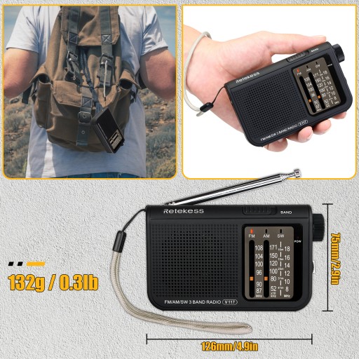 - 3-pasmowy odbiornik częstotliwości AM / FM / SW akceptuje więcej stacji; Jego niewielkie rozmiary i przenośność sprawiają, że jest to idealne przenośne radio do użytku w pomieszczeniach i na zewnątrz