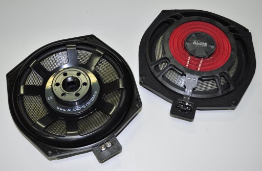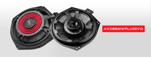 2 x woofer 200mm 2x AX08 BMW PLUS EVO - najnowszej generacji subwoofer z poszerzoną średnicą i membraną z plecionki włókna szklanego i węglowego Carbon, o dużej wytrzymałości, lekkości i neutralności wybrzmiewania. Układ z magnesem neodymowym wentylowany wielopunktowo od góry