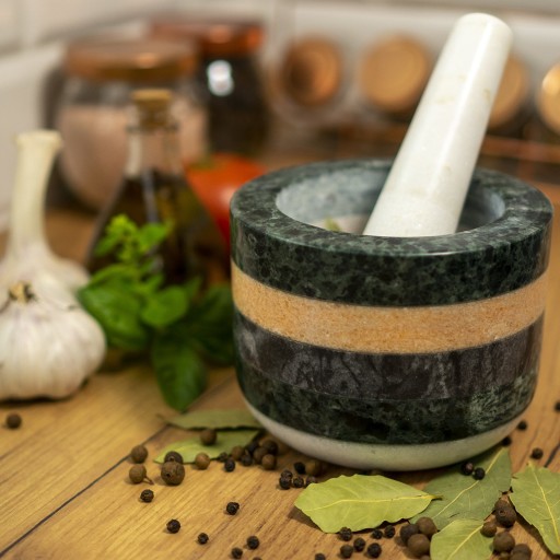 - Elegancka dekoracja — kolorowe paski granitu, a także błyszcząca zewnętrzna powierzchnia produktu, sprawiają, że prócz funkcjonalności moździerz staną się idealną dekoracją do każdego typu kuchni.