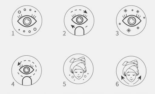 - Użyj głowicy masującej do masażu od wewnętrznego kącika oka, wzdłuż dolnego kącika oka powoli i delikatnie.